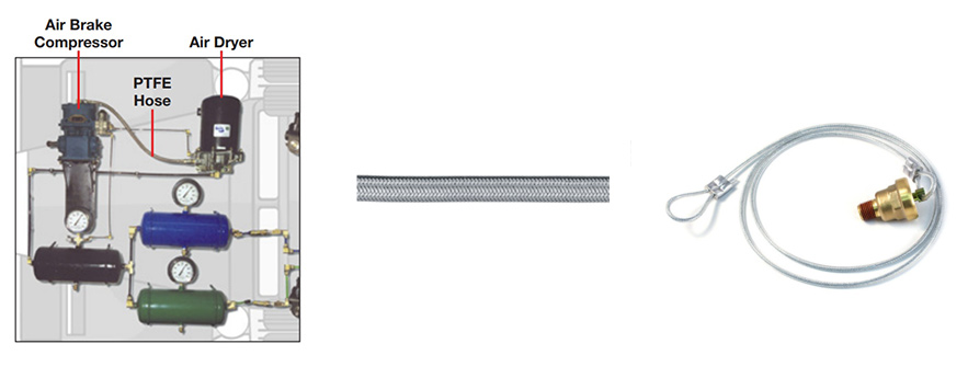 سیستم کمپرسور از سه مؤلفه تشکیل شده است: کمپرسور ، خشک کن هوا و شلنگ یا لوله اتصال. جریان هوا تولید شده توسط کمپرسور تا زمانی که شرط شود قابل استفاده نیست. با هوای فشرده شده خام دو مشکل وجود دارد. اول ، هوای ناشی از کمپرسور برای لوله های استاندارد خیلی گرم است. از شیلنگ PTFE برای اتصال کمپرسور به خشک کن استفاده می شود زیرا می تواند دمای آن تا 400 درجه فارنهایت را تحمل کند. شیلنگ PTFE را می توان با استفاده از نوار استیل ضدزنگ که هم به عنوان پوشش و هم تقویت کننده عمل می کند ، شناسایی کرد.